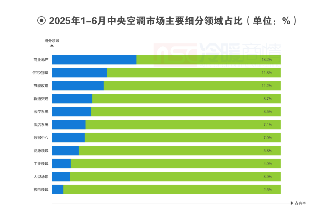 2025上半年中央空調(diào)市場需求結(jié)構發(fā)生顯著變化,傳統(tǒng)商業(yè)地產(chǎn)比重持續(xù)收縮,而創(chuàng)新業(yè)態(tài)板塊保持強勁增長勢頭,主要體現(xiàn)在酒店領域、數(shù)字基礎設施(數(shù)據(jù)中心)、綠色能源相關(新能源領域、生物醫(yī)療配套(醫(yī)療凈化)等方面。這種結(jié)構性轉(zhuǎn)變進一步反映出產(chǎn)業(yè)升級和消費轉(zhuǎn)型升級的雙重驅(qū)動效應。