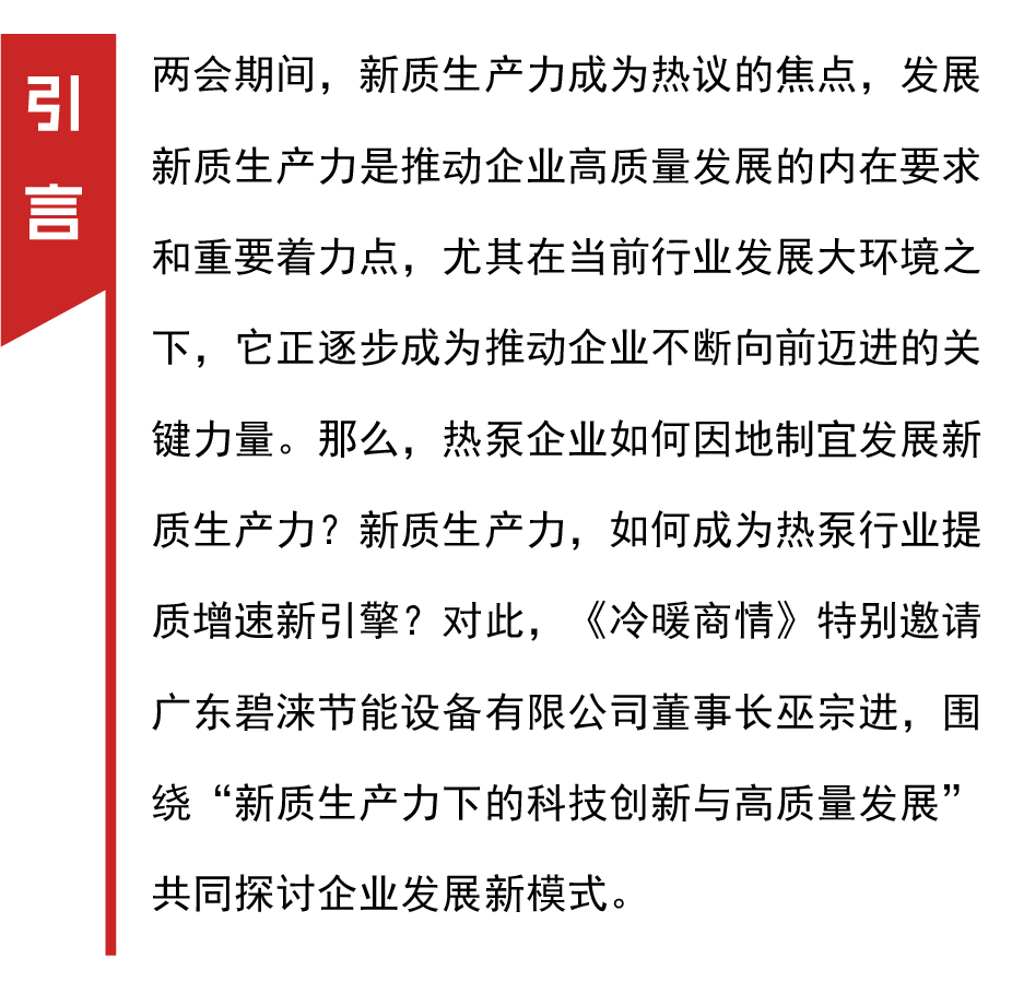 在與廣東碧淶節(jié)能設(shè)備有限公司董事長巫宗進(jìn)的對話中,他首先強(qiáng)調(diào)了新質(zhì)生產(chǎn)力對于暖通行業(yè)的重要性。他認(rèn)為,新質(zhì)生產(chǎn)力不僅僅是技術(shù)的升級和改造,更是一種全新的生產(chǎn)方式和思維模式。對于碧淶節(jié)能來說,發(fā)展新質(zhì)生產(chǎn)力的核心就是進(jìn)行創(chuàng)新,這包括產(chǎn)品創(chuàng)新和管理模式創(chuàng)新兩個方面。